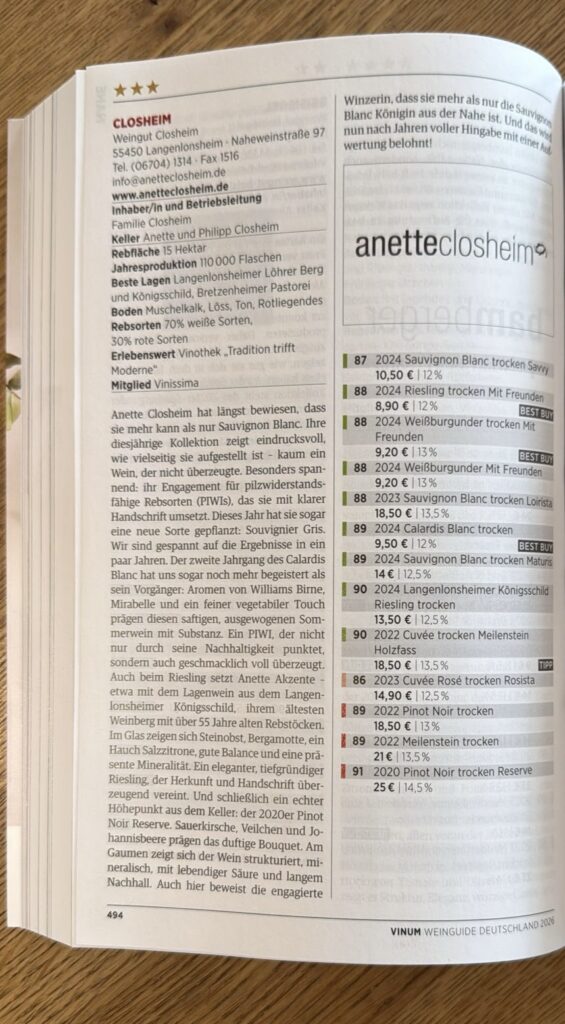 Die Vinum Redaktion schreibt: „Die engagierte Winzerin beweist, dass sie mehr als nur die Sauvignon Blanc Königin aus der Nahe ist. Und das wird nun nach Jahren voller Hingabe mit einer Aufwertung belohnt. Ihre diesjährige Kollektion zeigt eindrucksvoll wie vielseitig sie aufgestellt ist – kein Wein der nicht überzeugte!“